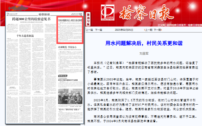 “检察官既解决了困扰我多年的用水问题,还修复了邻里关系。”近日,熊某向前来回访的云南省南涧彝族自治县检察院检察官表达了感谢。